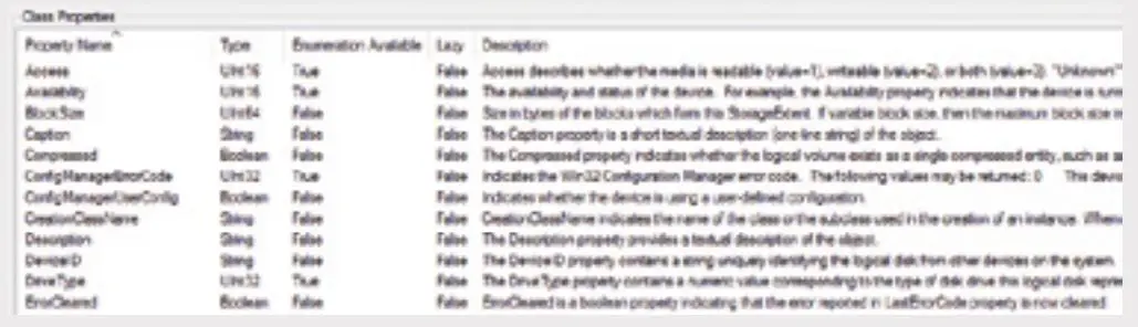 图 14 列出了一些 Win32_LogicalDisk 类实例中已公开的属性。此类定义声明了 40 个属性, Win32_LogicalDisk 类实例包含了每个属性具体的值。例如,DeviceID 属性是字符串类型,用于磁盘的唯一标识,所以一个 WMI 客户端可以枚举类实例并期望得到像 A:、C:,D: 这样的值。