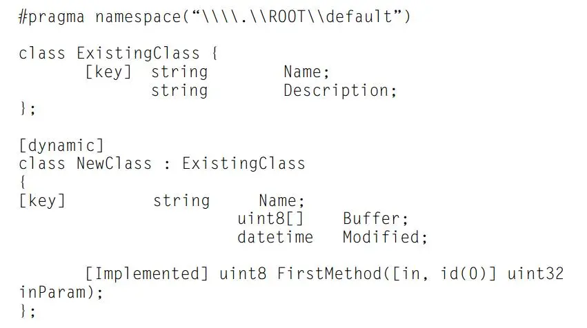 图 19 列出了在 MOF 中定义类的语句的结构,而图 20 列出了一个定义了两个新类: ExistingClass 和 NewClass 的 MOF 示例文件。在 \\.\ROOT\default 命名空间中,可以找到这两个类。ExistingClass 类有两个属性:Name 和 Description。Name 属性的 Key 限定符指示了它被用于唯一标识此类的一个实例。NewClass 类有四个显式属性: Name, Buffer, Modified 和 NewRef。NewClass 也继承了其基类 ExistingClass 的 Description 属性。NewClass 被标记了动态限定符,这意味着相关联的 WMI 提供程序将会按需要动态创建此类的实例。NewClass 有一个名为 FirstMethod 的方法,该方法接受一个 32 位无符号整数的参数,并返回一个 8 位无符号的整数值。