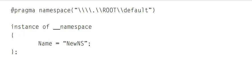 MOF 语言允许通过声明父命名空间并定义一个 __namespaceclass 的新实例来创建新的命名空间。例如,我们可以使用在图 18 中列出的 MOF 文件创建 \\.\ROOT\default\NewNS 命名空间。