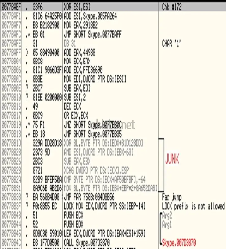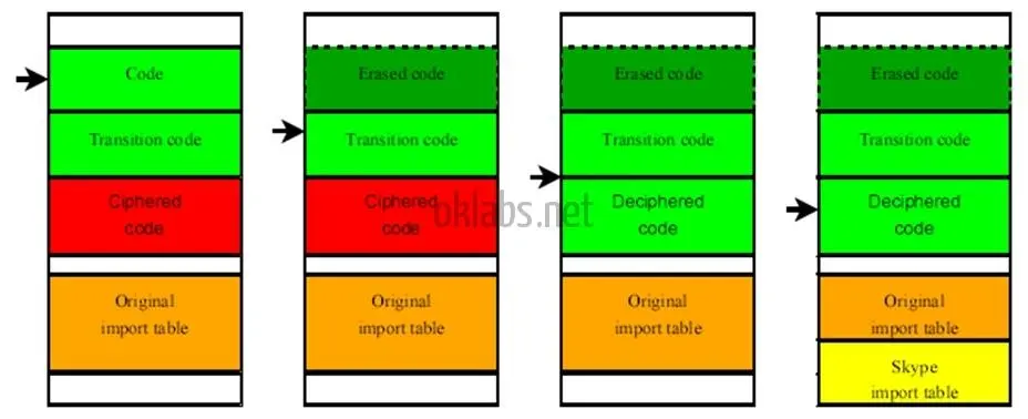 二进制文件的敏感代码使用一个硬编码的密钥进行加密以避免代码被静态分析。Skype客户端(SC)开始处有一个程序负责执行过程中解密敏感代码和加密部分代码。之后,解密器处理刚加密的代码,并擦除另一部分代码。后者的作用是为了防止解密的代码保存在计算机内存中。我当时设计了一个工具,用于从计算机存储器中完整提取出SC程序在运行过程中解密出来的代码,一旦解密程序解密完成,便把解密代码覆盖到保存在硬盘上的SC二进制文件中原有的加密代码。并防止解密程序在解密完成后的进行代码擦除。该程序还会修改导入表,该表包含了程序所使用的每一个导入函数。我设计的那个工具也设法把导入表的修改操作同步到磁盘上的二进制文件上。