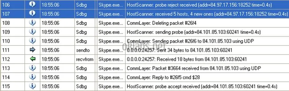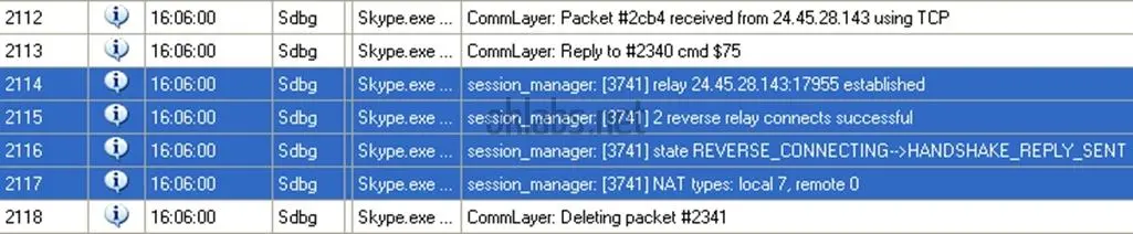 加上这样的详细报告,我就能够确定几乎没有什么网络数据包是伪造的,而且还能帮助理解接收/应答对等网络的数据包。实际上,这些报告还能够让我快速定位部分有趣的汇编码,如通过单步调试以便理解如何数据包是如何构建。报告还帮助我了解Skype会话的不同阶段,从断开状态,初始化通讯会话,首次进入P2P网络,在网络上登录认证本节点,动态联系人列表的获取,根据要求响应P2P协议。