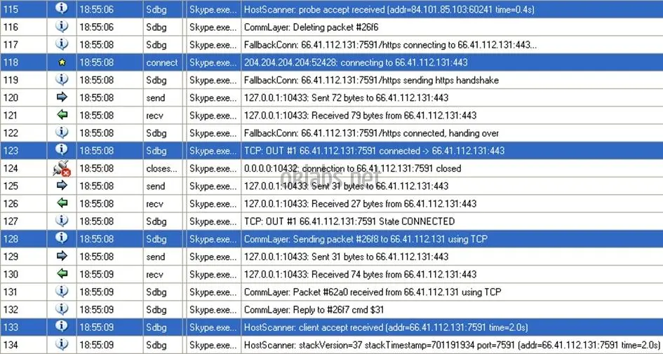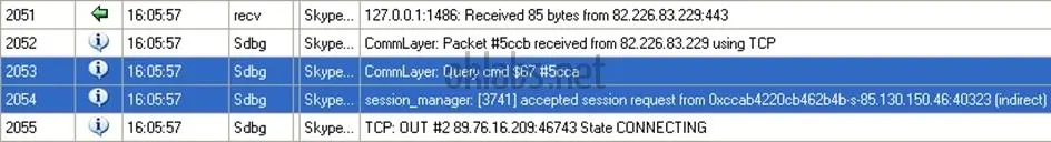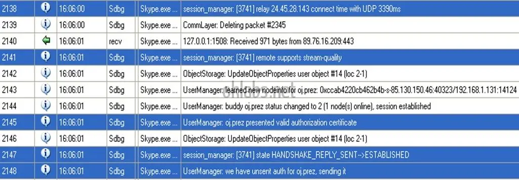 在分析的第一步,是保存各种诸如首次连接没有缓存数据,重连,错误的验证数据(用户名/密码),成功的连接,聊天初始化等等,所有的数据的传送都是通过Skype网络完成。这里已经有调教好的OSpy设置,带有网络功能入口点hook和收集发送到这些功能的参数(参数包括发送到/接收自网络的数据)。