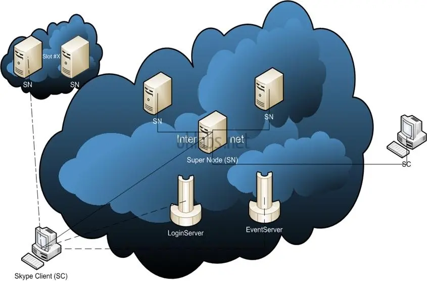 Skype网络是基于P2P网络模型,Skype客户端同时作为客户端和服务器使用。每个SC在网络表现为一个“node”。然而,那些带宽好,CPU棒的客户端可能会被晋升为“超级node(SN)”。超级node在Skype网络上作为普通node的接口,帮助普通node路由请求和提供网络信息。也有特殊的超级node用于防止直接连接这种特殊的网络情况,每个SC二进制文件都包含适当的超级node和普通node行为的代码。