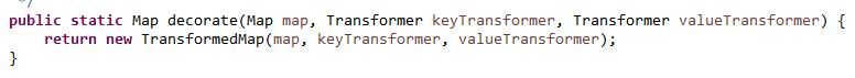 调用这些transform方法的是一个叫TransformedMap的类,这个类可以当做原生Map类的一个包装类(通过TransformedMap.decorate方法)。进入这个类一探究竟:
