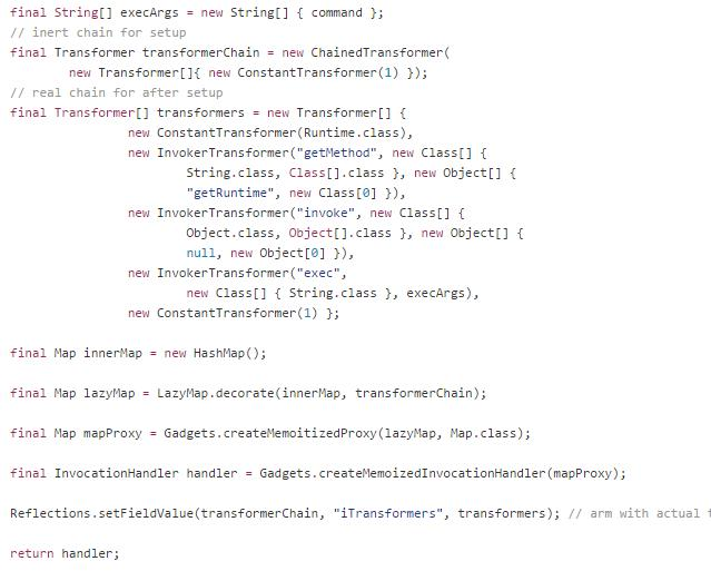 首先exp里构造了transformer对象数组并用LazyMap进行包装,包装后装到一个handler对象里并返回这个handler。