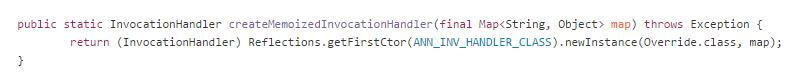 利用反射,获取到AnnotationInvocationHandler的构造函数,并传入了我们的map,getInstance返回一个handler对象,完成了所要求的一切,之后,找个使用可控序列化的地方发送这个序列化handler即可执行我们的代码。