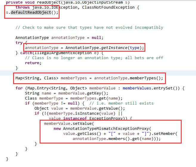 这里配合我们执行代码的类就是AnnotationInvocationHandler,我们来看看readObject方法里面有什么逻辑: