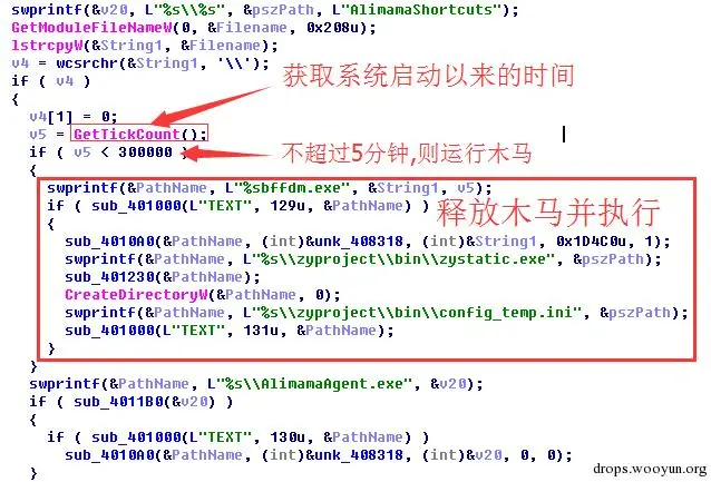 木马母体伪装成阿里妈妈推广程序,其资源中放有三个文件,一个是真正的阿里妈妈推广程序AlimamaAgent.exe,一个是木马文件,另一个是配置文件。母体运行后首先判断系统启动了多久,如果不超过5分钟的话则释放出木马并执行,然后再释放阿里妈妈推广程序;如果已经超过5分钟的话则只释放阿里妈妈推广程序,不释放木马。此方法可以绕过很多未重启的自动化分析系统、沙盒等。同时系统刚启动的数分钟内通常是安全软件防御的薄弱时期,此时木马往往可以乘虚而入,执行敏感操作。