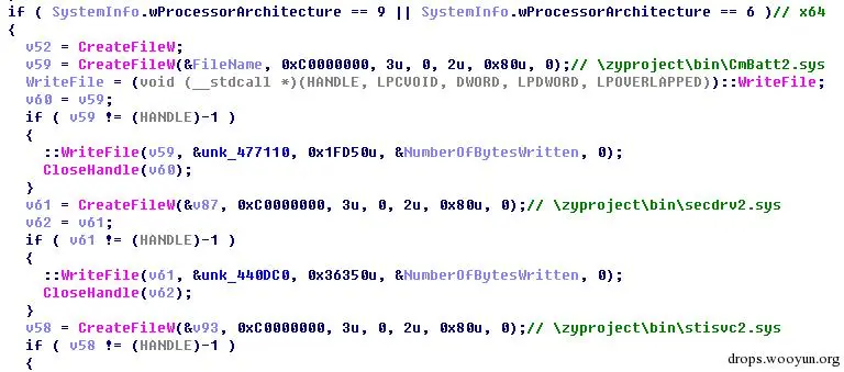 图5. 释放CmBatt2.sys、secdrv2.sys、stisvc2.sys、zystatic.exe、zyinstall.dll五个文件,木马会首先判断系统类型,如果是64位系统,则释放的驱动为64位驱动,功能类似