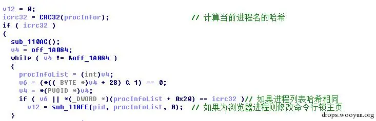CmpBatt2.sys主要用于锁定浏览器主页,锁主页的方式是通过注册创建进程回调,在回调函数中比较进程名的CRC32值,如果在列表中(木马内置了一个各种浏览器进程名的CRC32列表),则通过添加命令行的方式进行主页锁定。同时,该文件还负责清除与主页保护相关的其它文件。