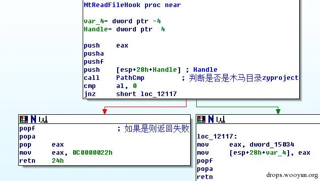 2) Ssdthook:hook了NtQueryInformationProcess,NtQuerySystemInformation,NtReadfile,判断操作者是否为安全软件进程,如果是则阻止。