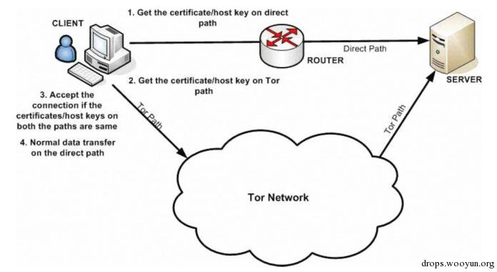 洋葱网络的特点是当用户访问某一个固定的目的端,每次经过的路径是随机的。具体来说,TOR客户端维护一个浏览器一样的代理,其他软件可以使用该代理提供的借口,进入Tor网络,TOR节点在不同次的连接时会选择不同的路径,不会轻易被中间人攻击。利用洋葱网络的这一特点,可以进行多路径证书检查。