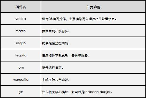 这些插件实现了接受远程服务端指令、恶意扣费、短信拦截监控、心跳、日志提交、下载和更新插件等长老木马四代的所有核心功能。