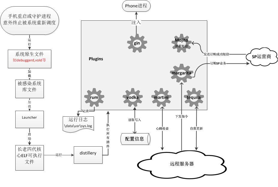 长老木马四代主要分为launcher和核心作恶的ELF可执行模块。ELF可执行模块又包括distillery、plugins及redbean三个主要部分。 redbean模块会注入系统Phone进程,具有Phone进程权限,可以在未经用户允许下,后台私自订购SP业务,屏蔽订购确认和成功短信,给用户造成经济上的损失。