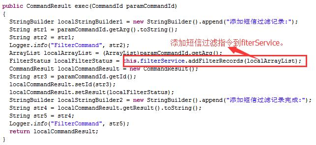mojito插件:完成手机短信监控的功能,过滤关键词由远程服务器下发,主要屏蔽SP扣费业务订购成功或确认短信,使用户无法察觉到自己订购了SP业务,短信监控相关部分代码如下: