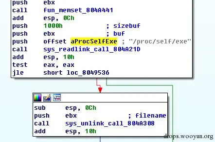 sys_readlink()读取/proc/self/exe获取文件路径,sys_unlink()进行删除,处理函数地址为0x80494F3。