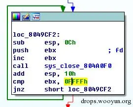 暴力关闭文件,关闭0到0xFFFF的文件,调用系统调用sys_close(),函数地址为0x8049C77。