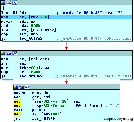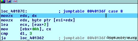 我们现在处于“case 0x18”这个操作码,因为编译器增加了一个减法操作优化这段代码。如果你现在回去检查一下vm_file的话可以发现第一个字节就是0x18。这个操作码似乎需要一些操作数,所以VM多读取一个字节到DX寄存器。下一步,VM的指令指针[EBX+0AH]更新为EAX+2,这意味着IP(instruction pointer)指向下一个字节。之后,读取到的字节跟3比较,如果大于3则离开循环并抛出一个异常。但在我们的例子中是不会抛出异常的,因为二进制文件中该操作数等于0x01,因此程序不会发生跳转。接着我们到达这里: