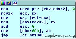 在正确读入字节之后我们注意到DX寄存器的值被保存到[EBX + 0AH]。这位置是虚拟机分配的寄存器空间。我们现在知道EBX寄存器指示着ESI寄存器所指向的文件数据在内存中的位置。