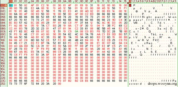 用十六进制编辑器打开vm_file文件,取出0x80到0x17F偏移处的256个随机字节,我们可以把它称之为Random。将用户输入的密码每个字节都跟Random异或运行,然后跟vm_file文件在0x240偏移处预定的数组做比较。