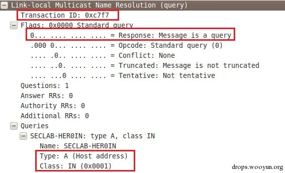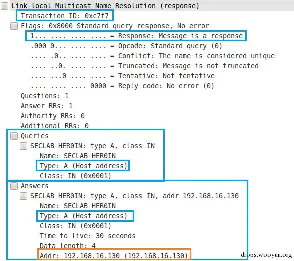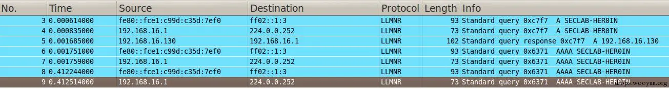 使用 Wireshark 抓取一个完整的 LLMNR 质询/应答过程的数据包,如下图所示: