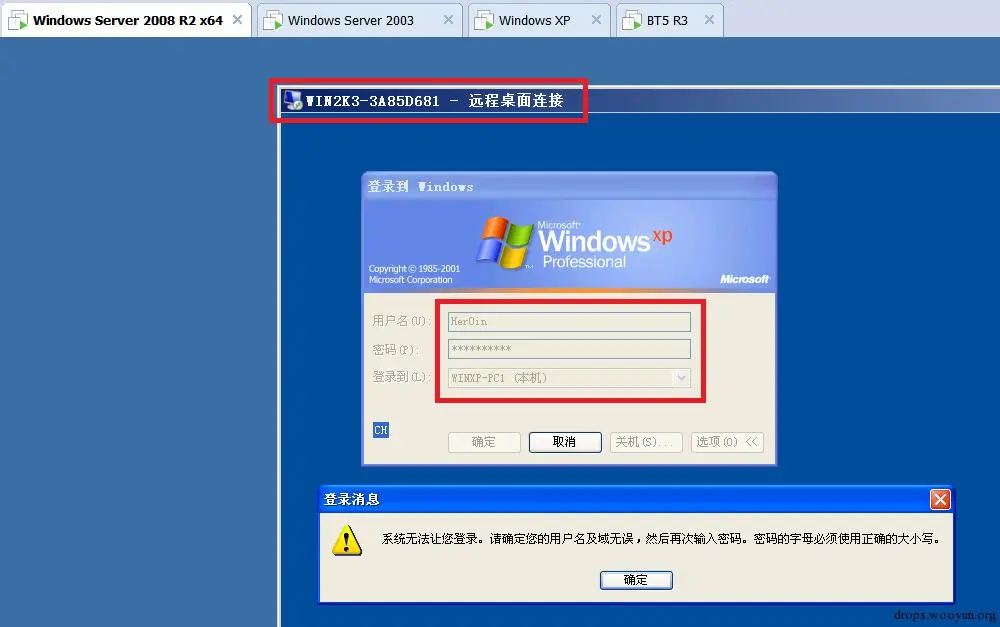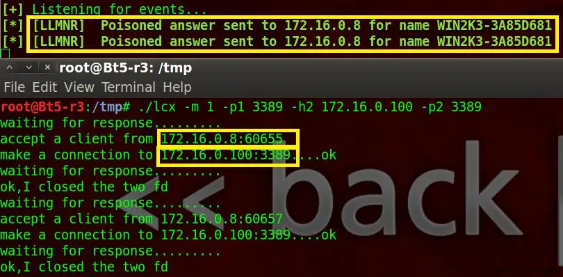 管理员的主机(Win2k8)连接内网服务器(Win2k3)进行常规维护,攻击者(BT5-R3)利用 LLMNR Poison 攻击劫持了 3389 连接会话,为了更加明显的演示出攻击效果,我将 3389 连接会话重定向到一台 XP 中。