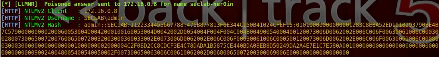 - 此时攻击者的主机(已启动了 Responder )就会收到受害者主机的 HASH。