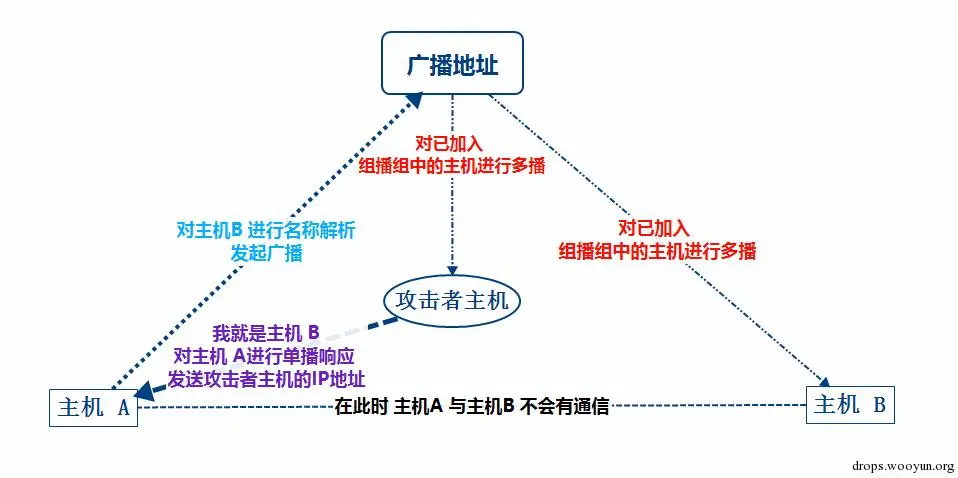 攻击者可以将自己的主机加入到组播组中,当收到其他主机进行名称解析的质询请求,就可以对发起此次名称解析的主机进行“恶意”应答。利用此缺陷进行欺骗攻击的方式称为 LLMNR Poison 攻击。