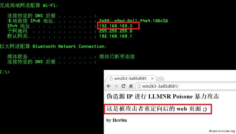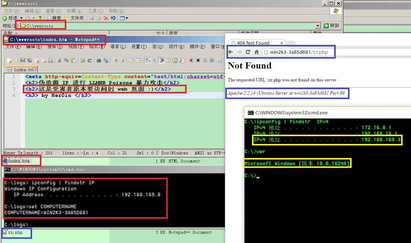 攻击的效果就是,受害者只要使用计算机名称访问 HER0IN-PC 这台主机的任何服务,都会被重定向到攻击者指定的 IP 上。