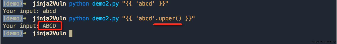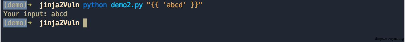 为了方便演示,这里直接将命令参数输入拼接为模板内容的一部分并进行渲染输出,这里我们直接输入 {{ 'abcd' }} 使模板直接渲染字符串变量: