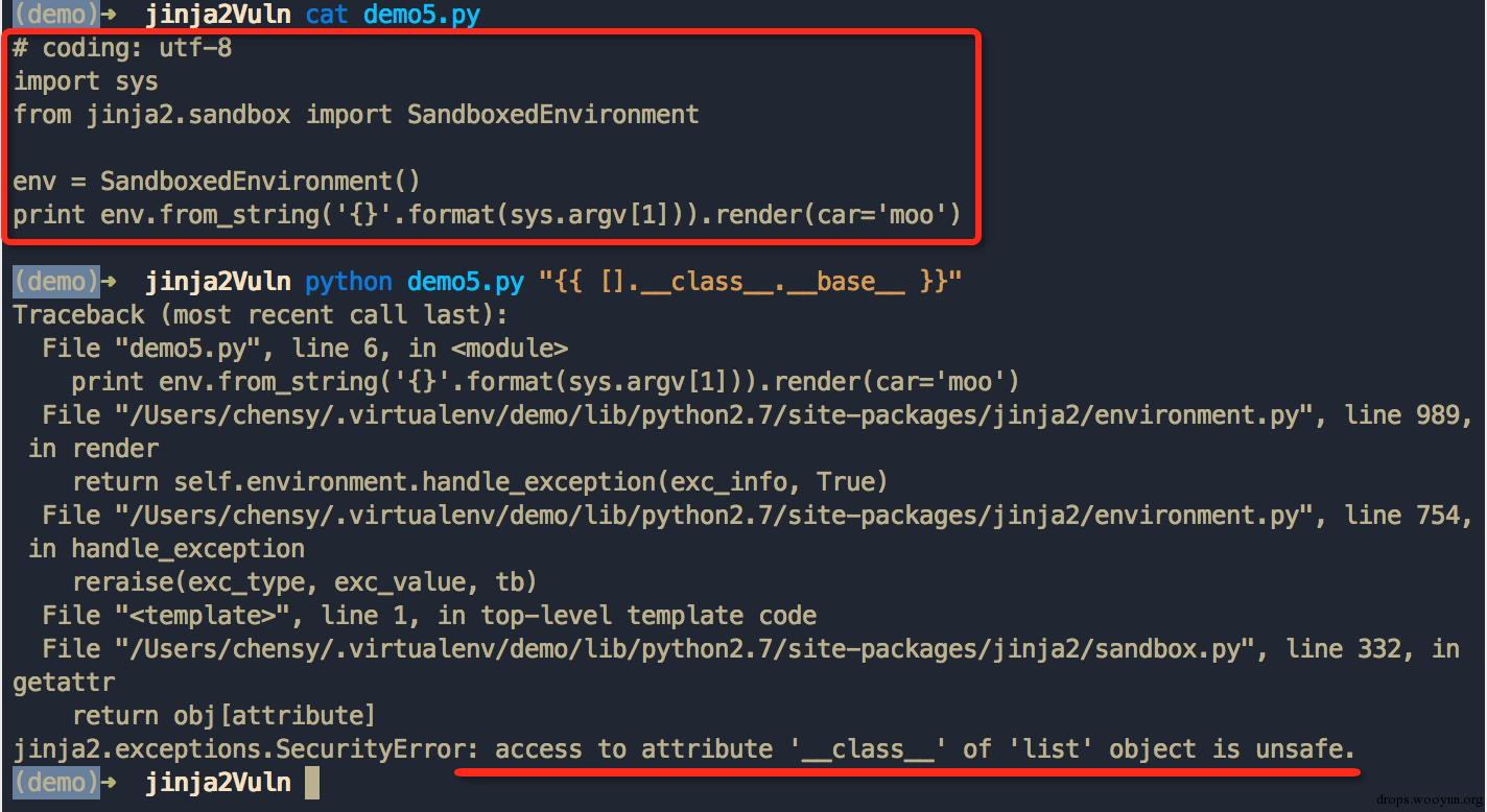 在 Jinja2 模板中防止利用 Python 特性执行任意代码,可以使用 Jinja2 自带的沙盒环境 jinja2.sandbox.SandboxedEnvironment,Jinja2 默认沙盒环境在解析模板内容时会检查所操作的变量属性,对于未注册的变量属性访问都会抛出错误。