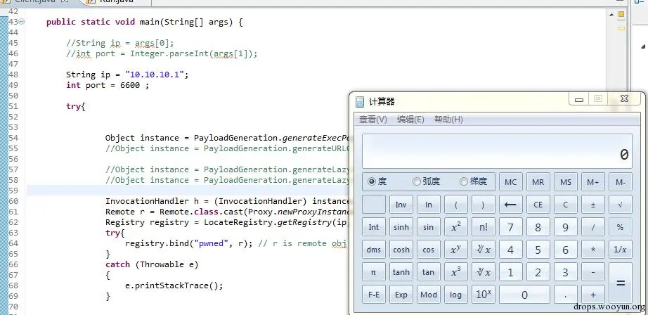 这里将java反序列化漏洞的payload封装了下,PayloadGeneration.generateExecPayload("calc");会产生一个执行calc命令的对象,有兴趣的可以在我的github上查看源码。然后,将我们的payload发送到RMI服务端口进行攻击。