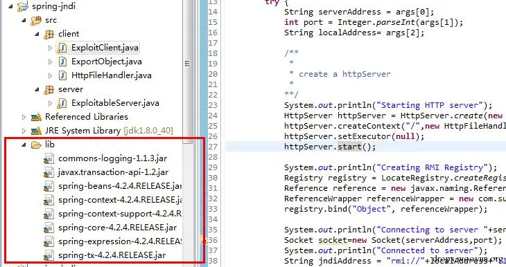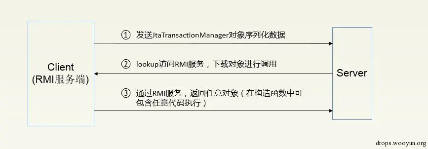 Client端即为攻击方,它向目标服务器发送JtaTransactionManager序列化对象后,会触发server端进行访问Client端(即:这时的RMI服务器端)中的RMI服务,去下载任意java对象进行执行。关键代码为: