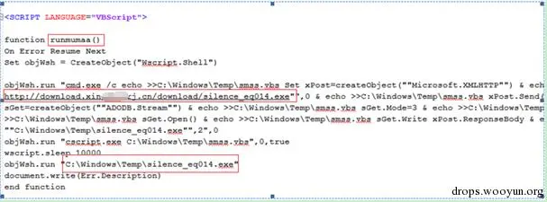 该广告页同时利用了两个漏洞进行挂马以提高挂马的成功率,两种攻击方式最终目的一致——触发下载木马安装器,下载地址: hxxp://download.xin*****rj.cn/download/silence_eq014.exe