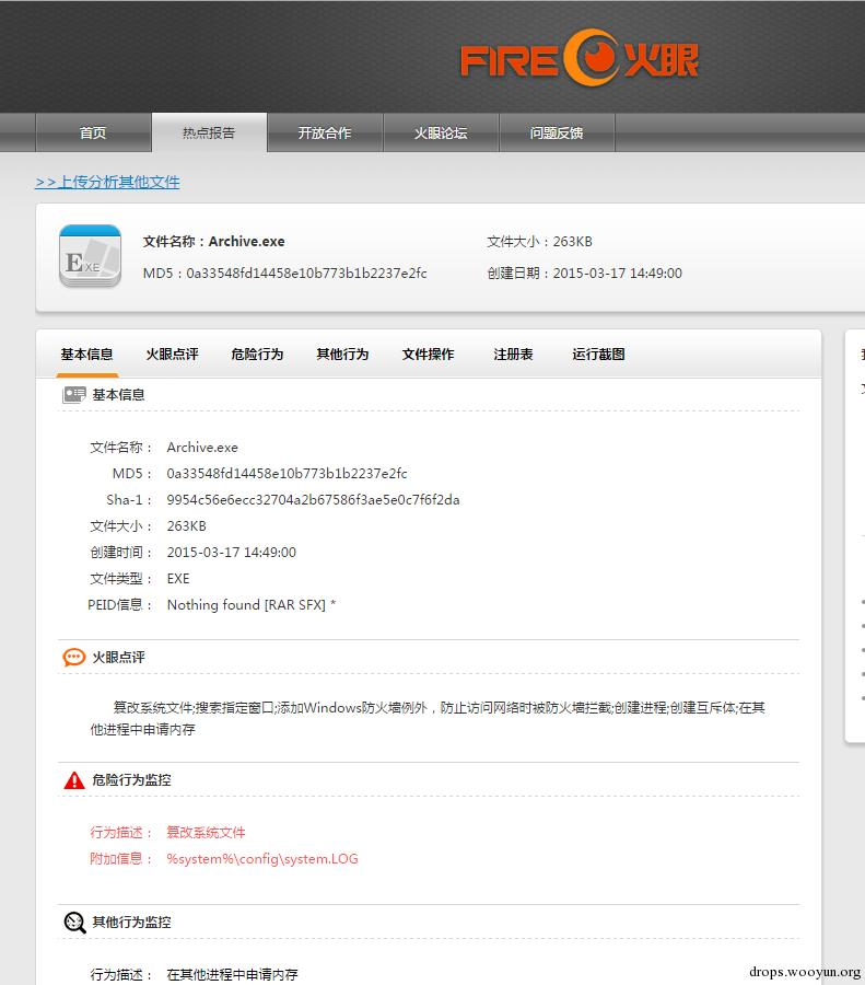 这个漏洞我已在去年提交给乌云:火眼恶意代码分析系统自保机制绕过导致二进制泄露