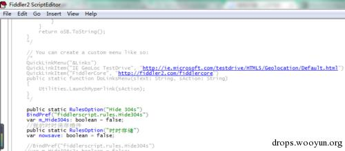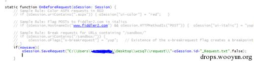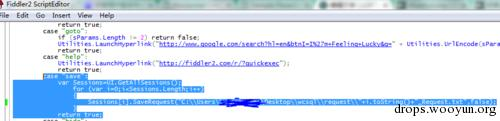 然而这还不能满足我们的需求,因为在工作中我们需要对一些特定的请求进行过滤后再进行测试,比如一些请求有插入数据的功能列如评论,如果这种请求进行自动化探测的话,会带来大量的垃圾数据,往往测试时需要过滤掉。另外时时存储会保存大量request,全部都进行测试效率会降低。利用fiddler的过滤规则,我们已经能够保留我们希望测试的request,如果能有一个命令,能一键保存我们过滤留下的session,那效率将会大大提高。然而fiddler并没有这样的功能,就像上边说到的,保存request每次都会弹框点击确认才行。我们再来看看Fiddler 2 Script Edit是否能解决这个问题。果然在OnExecAction函数下可以让我们自定义命令,输入命令后,执行我们想要的代码,直接上代码: