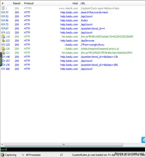 增加一个case,循环保存即可。虽然上面的代码很简单,但是我却分析学习测试了好长时间,包括哪些fiddler的函数可用,用哪个类等等,这段过程就比较曲折了,就不多说了。 来看看效果,打开fiddler,在左下角输入命令save