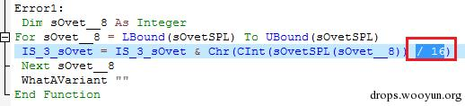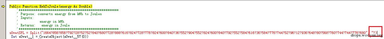 样本以“?”作为分隔,使用Split生成数组,再传递给解密函数解密。但是我们在调试过程中发现,样本的宏代码中,Split函数最后缺少了闭合符号”,导致样本执行报错: