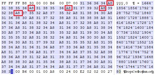 正当我们准备结束这次分析,得出该系列样本是攻击者进行免杀测试的样本的结论时,我们顺便看了一下样本二进制中加密的URL数据,居然发现原始二进制中的加密URL数据和Word宏代码中显示的数据不一致,而二进制中加密URL的分隔符并不是”?”,而是0xA8: