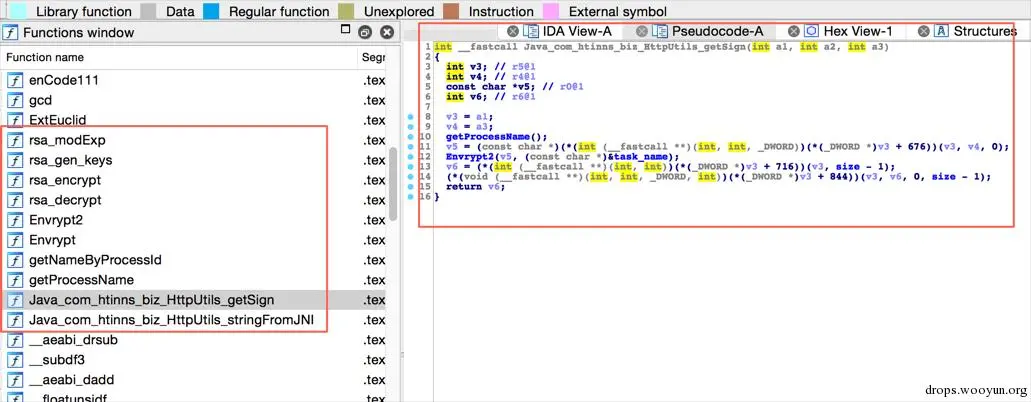 4、用ndk开发,将密钥放在so文件,加密解密操作都在so文件里,这从一定程度上提高了的安全性,挡住了一些逆向者,但是有经验的逆向者还是会使用IDA破解的。