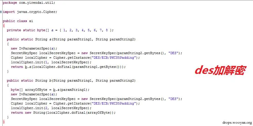 发现DES算法的密钥,硬编码为“yrdAppKe”,用来加密手势密码: