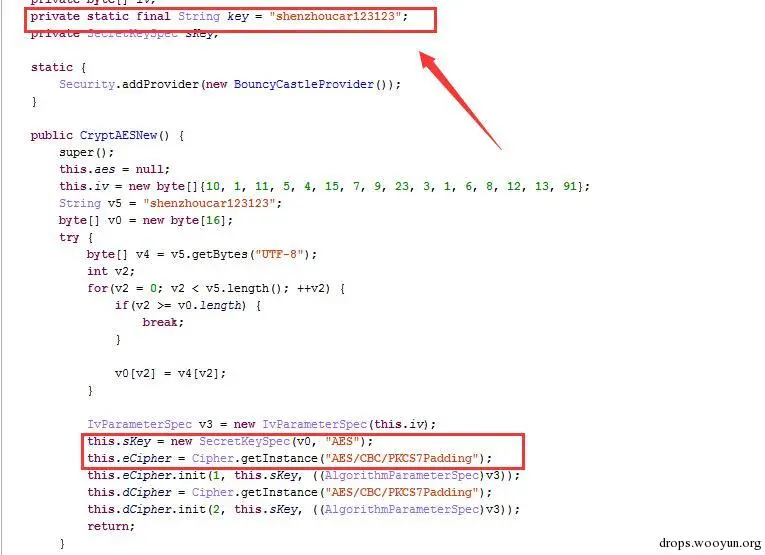 在onEncrypt()函数中调用了encrypt()函数用来加密数据,追踪encrypt()函数的实现,发现其使用AES算法,并且密钥硬编码在java代码中为“shenzhoucar123123”