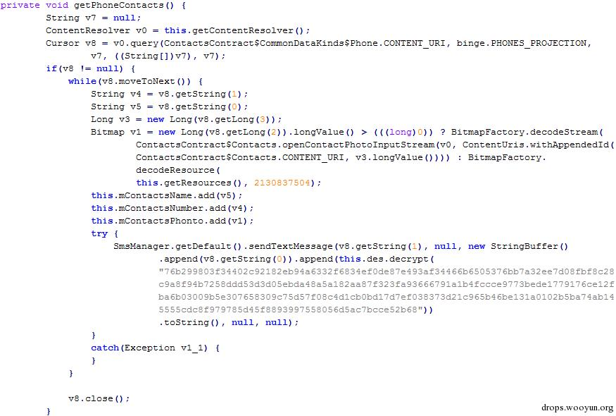 图1.2 木马遍历联系人群发短信的代码片段