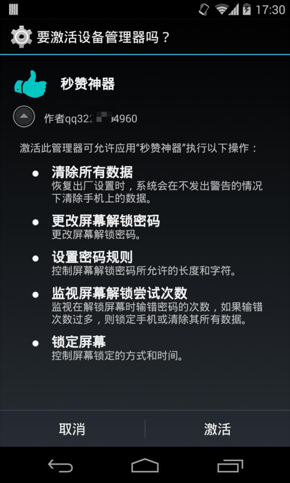 在“秒赞神器”申请激活设备管理器页面上,制马人留下了自己的QQ联系方式。