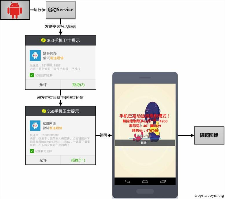 2月25日:制马人开始制作新型的勒索软件,新型勒索软件主要是将勒索软件以子包的形式隐藏在另一个软件中,后者安装运行后会通过一些文字提示诱导用户授予Root权限,同时将前者安装到手机系统软件目录中,这种锁机方式被制马人称为“Root锁”。