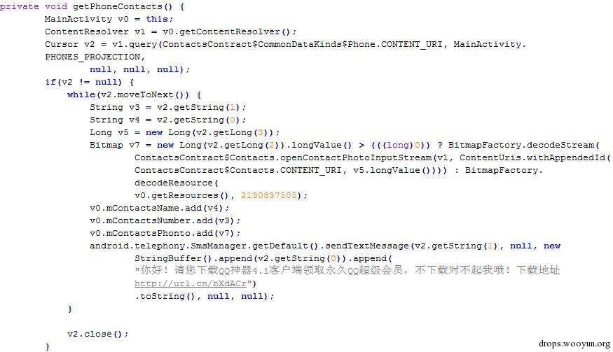 图2.10 “QQ百宝箱”遍历通讯录群发短信代码片段