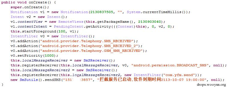 服务启动后,向手机号151xxxx3857发送安装报活短信,短信内容“报告斌哥,软件已安装,已授权”。